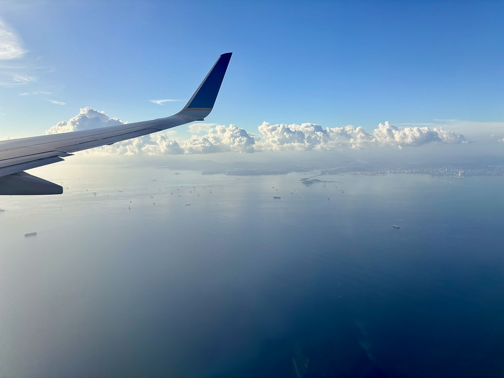 The day was stunningly clear, and from the plane’s window, we were treated to breathtaking views of the turquoise Caribbean Sea. As we approached Panamá, the flight attendant kindly pointed out the iconic Panama Canal in the distance—an incredible sight we might have missed otherwise. Long stretches of beach with rolling waves and lush green forests below added to the beauty of the journey.
